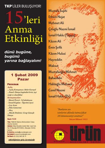 Bu yılki anma etkinliğimiz 1 Şubat 2009 Pazar günü saat 15.00'te İstanbul Taksim'deki Makine Mühendisleri Odası toplantı salonunda gerçekleştirilecek. Anma programı TKP emektarı Bekir Karayel'in açılış konuşmasıyla başlayacak. Ardından "Dünya Kapitalist Krizi, İşçi Sınıfı ve Olasılıklar" başlıklı bir panel gerçekleştirilecek. Panelde iş hukukçusu Murat Özveri ve öğretim üyesi İsmail Kaplan konuşmacı olacak. Ayrıca etkinlik programında şiir dinletisi, film gösterimi, skeç, ve Grup Güneşli Dünya'nın müzik dinletisi de yer alıyor. Katılımın ücretsiz olduğu etkinliğimize tüm dostlarımızı bekliyoruz.