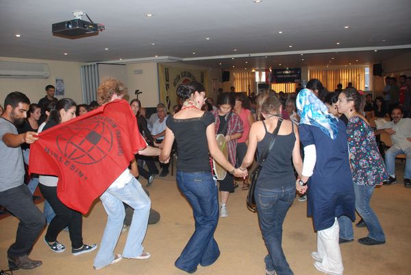 Güneşli bir dünya içinSahne Grup Güneşli Dünya'nın... Grup Güneşli Dünya şarkılarına başlamadan önce, grup adına Tuba arkadaşımız konuşma yaptı. Grubun adının İsmail Bilen yoldaşın kitabından geldiğini anlatarak, şarkılarını güneşli bir dünya için seslendirdiler. Bizlere bizim şarkılarımızı seslendirdiler. Yalnızca bizim toprağımızın değil, kardeş coğrafyanın acılarını, umutlarını da dillendirdiler. Şarkılar, marşlar salondakileri coşturdu. Alkış seslerine halaylar zılgıtlar eşlik etti.